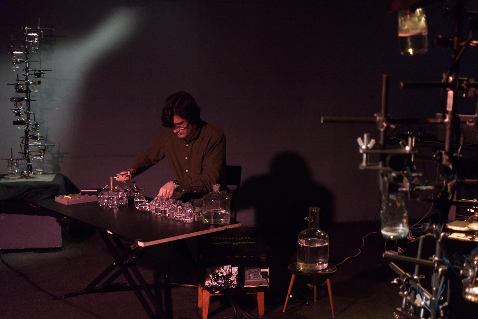 His current solo work focuses on an acoustic synthesizer—a sound installation of tuning forks, electromagnets, and glass bottles that produces sound through physical interaction alone. The sound is heard directly from the objects—no loudspeakers or digital processing.