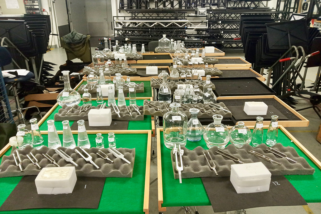 Andrés Nuño de Buen / acoustic synthesizer inspired by the 19th-century polymath Hermann von Helmholtz—a sound installation of tuning forks, electromagnets, and glass bottles, with sound heard directly from the objects—no loudspeakers.